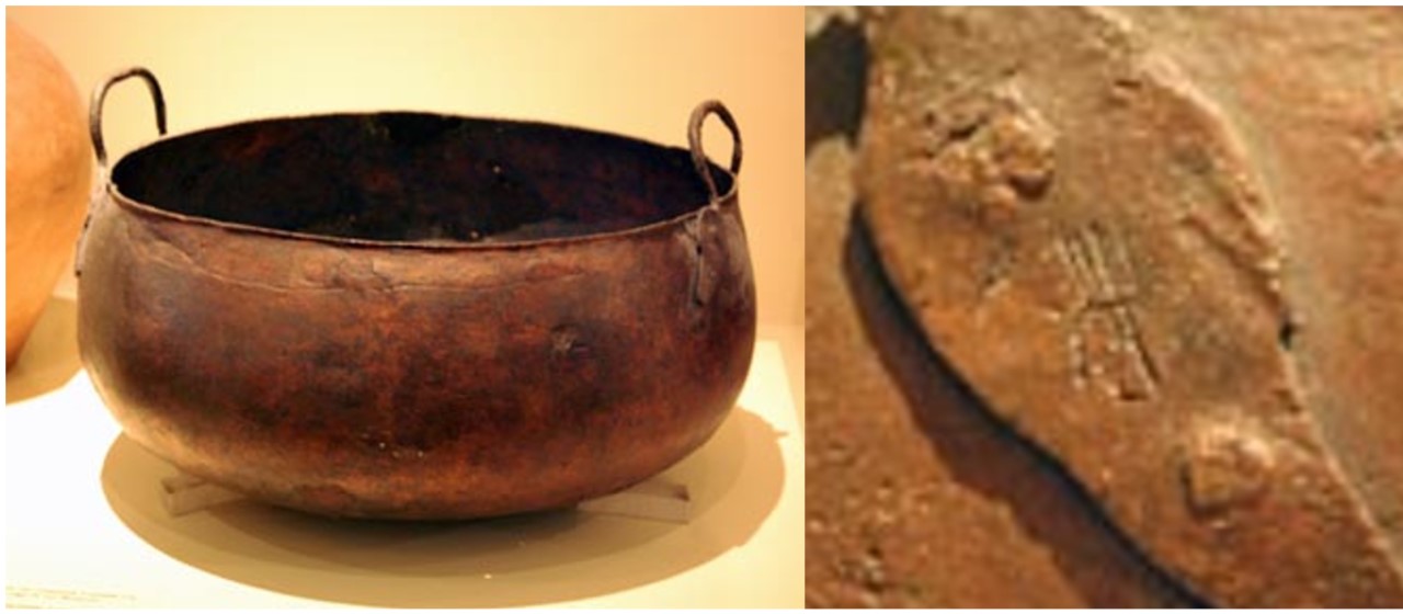 Notes: As early as 2500 BCE, dyes have been used in Mesopotamia, especially among the Egyptians, who used indigo and woad. By the Hellenistic period, the practice of using vats (cauldrons) to dye wool with indigo was common [“Seeds”]. In Japan, “[a]rchaeologists have uncovered indigo-dyed cloth [that has been] buried for over a thousand years” [Perez 2002:205-6]. The inscription on the flange appears to limit this cauldron to the use of indigo; a chemical analysis, or perhaps a scraping, of the inside of the cauldron may confirm this conjecture. Moreover, it is likely that the occupant of Shaft Grave IV was the dyer who used the cauldron.