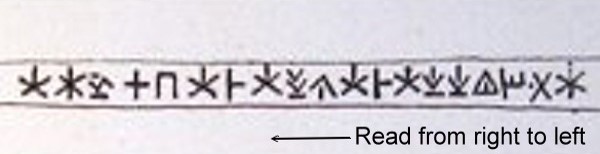 Annotation: Note that ICS 219 shows a diagonal mark just left of the upper-right arm of the seventh sign (from left). Whereas Masson [1961:219, Fig. 64] includes this mark to render /ke/, Lang [Schmidt 1876:pl. VII] omits this mark to render /i/; it is probable that Lang construed this as a stray mark, perhaps because it did not quite meet the upper end of the right arm.