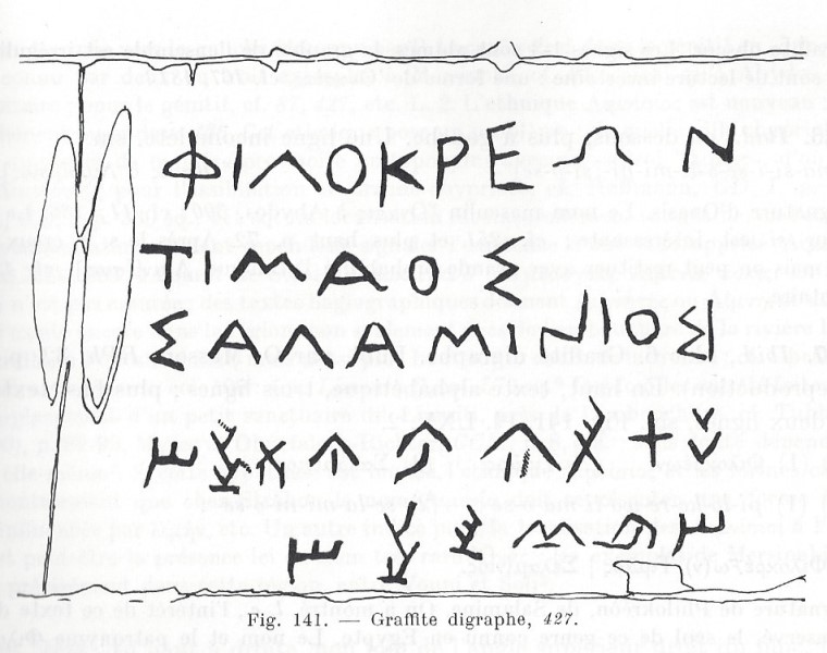 Karnak is a vast, ancient-Egyptian complex of chapels and temples, which includes the well-known temple of Amon. Due to long neglect, graffiti was allowed to flourish on the site’s many walls. Located on the east wall of the temple of Achoris, ICS 427 is a digraph that includes both the alphabetic and the syllabic Greek versions of the message. Achoris was a pharaoh of the 29th Egyptian dynasty (399-380 BCE); this dating supports the belief that syllabic Greek was used between the eleventh and the fourth centuries BCE.