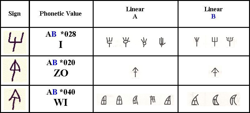 The linear-script word has been transliterated as (1) i-pi-ti, a proposed inscription that supports a digraphic misreading of ΕΠΙΟΙ as ΕΠΙΘΙ; (2) the alternate, i-pi-wi; and (3) i-zo-si, which is closest to my reading of i-zo-wi. The table demonstrates that the first sign is an LB variation of AB *028 I, the second sign appears to be a variation of AB *020 ZO, and the third sign appears to be an LB variation of AB *040 WI. Consequently, I regard i-zo-wi as an LB word.